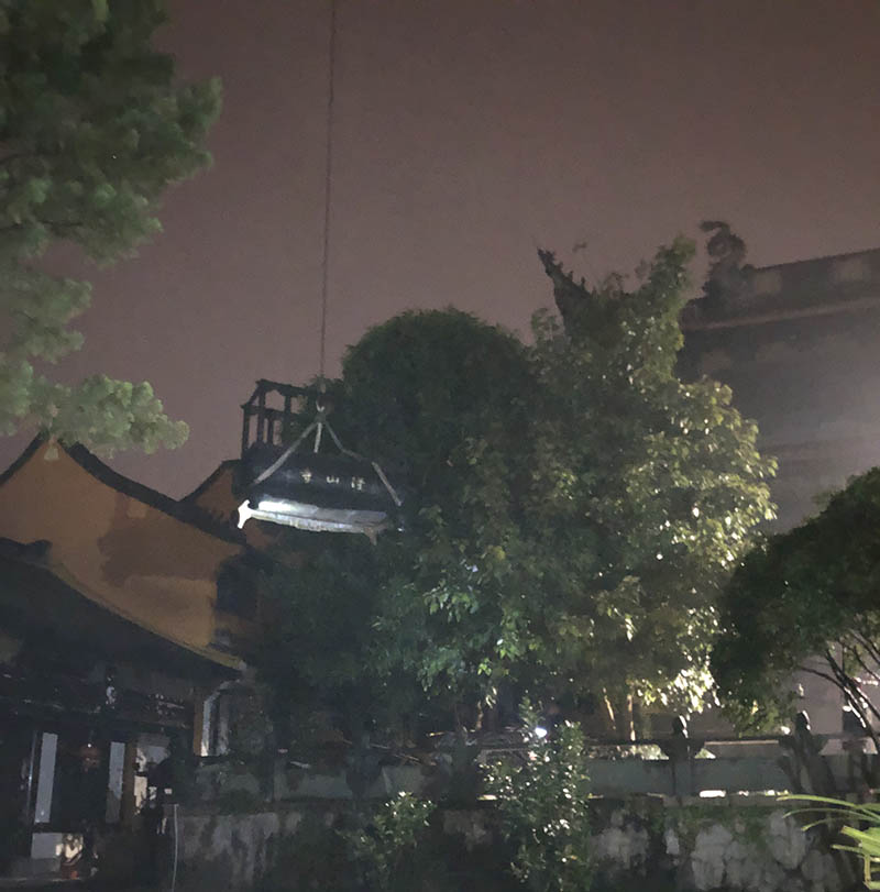 只见铁臂轻松起吊重达三吨的新香炉,伸向120米高空进入隆山寺围墙,越过右厢房,稳稳到达大雄宝殿前,古朴庄重的万年香炉就此安奉隆山寺。了证大和尚亲自指挥并且亲眼见证了整个过程,参与此次安放工程的志愿者们、工作人员乃至瑞安市民亦为伟大祖国的强盛和佛教繁荣欢欣鼓舞。